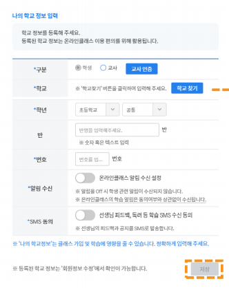 ebs 온라인 통합회원 가입을 마치셨다면, 학교 정보 입력을 해야 합니다. '학교 찾기' 버튼을 누른 다음 본인이 다니고 있는 학교를 찾고 그에 해당하는 정보를 입력해줍니다.