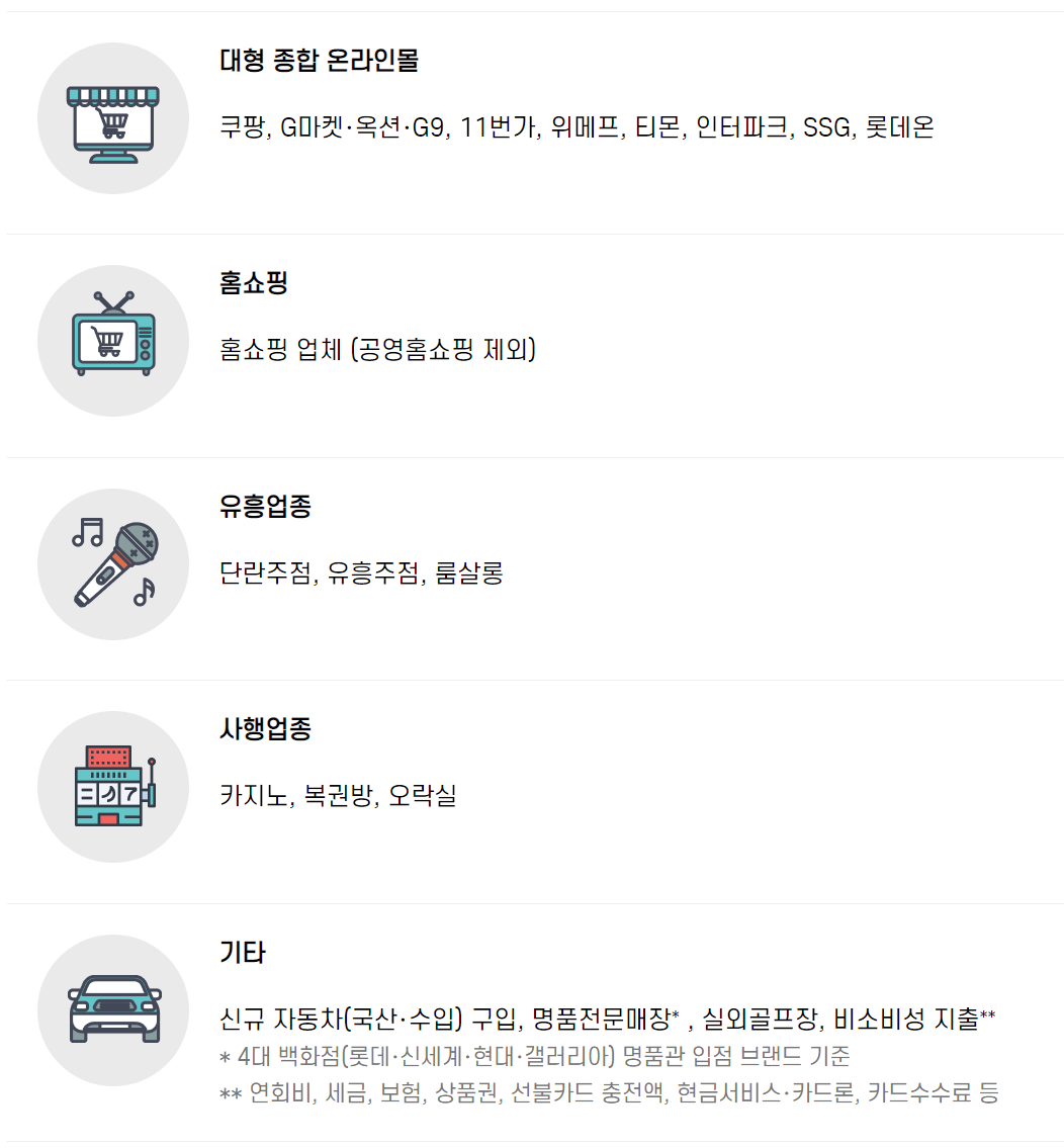 ** 연회비, 세금, 보험, 상품권, 선불카드 충전액, 현금서비스·카드론, 카드수수료 등