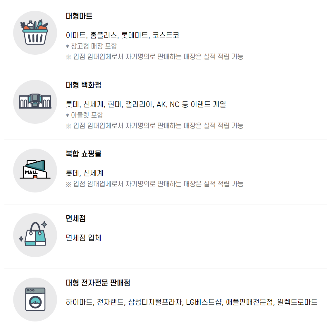 롯데, 신세계, 현대, 갤러리아, AK, NC 등 이랜드 계열 * 아울렛 포함