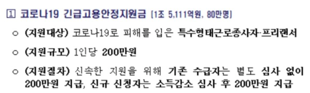 대리운전기사, 방과후강사, 방문교사 등 코로나로 인해 생업에 피해가 지속되고 있는 직종의 특고·프리랜서가 긴급 고용안정지원금의 대상입니다. (최대 100만원)