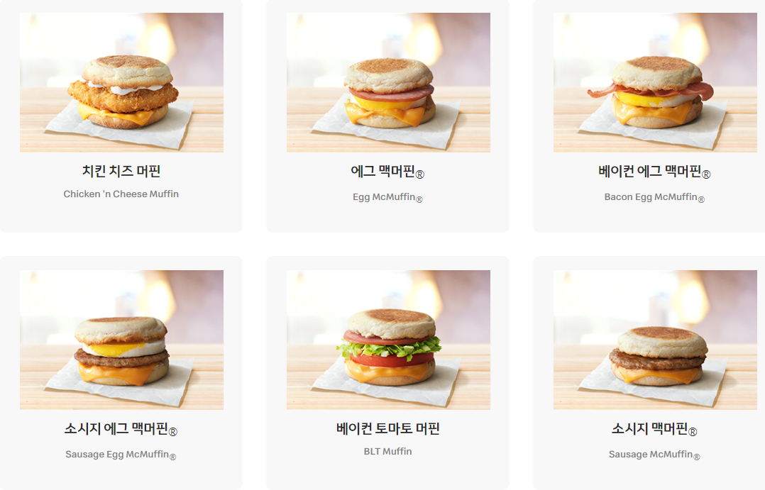 치킨 치즈 머핀, 에그 맥머핀, 베이컨 에크 맥머핀,