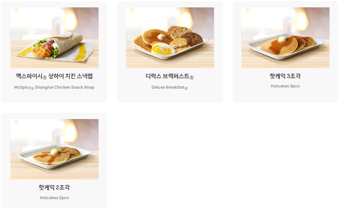 소시지 맥머핀 세트, 디럭스 브렉퍼스트 세트 , 핫케익 3조각 세트로 구성되어있다.